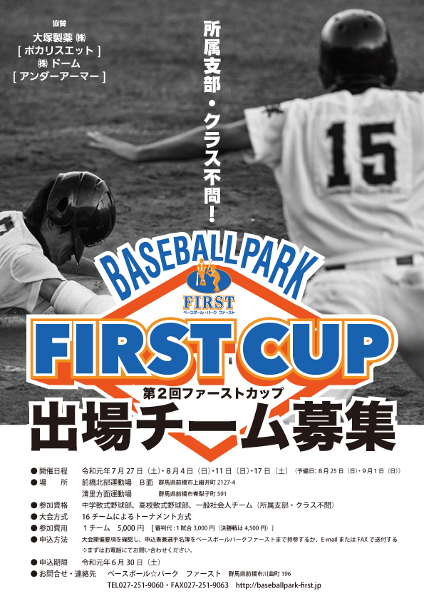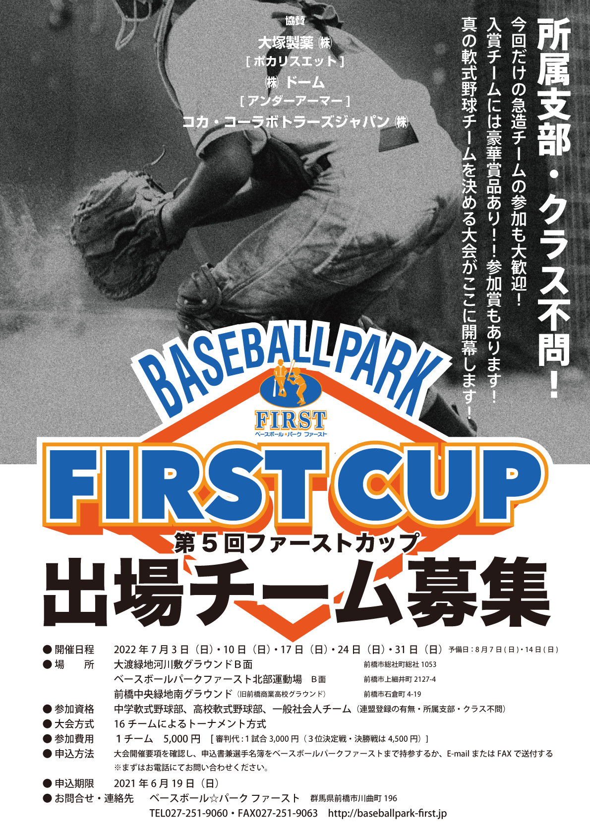 | 申込方法 | 大会開催要項を確認し、申込書兼選手名簿をベースボールパークファーストまで持参するか、E-mailまたはFAXで送付する※まずはお電話にてお問い合わせください。 |