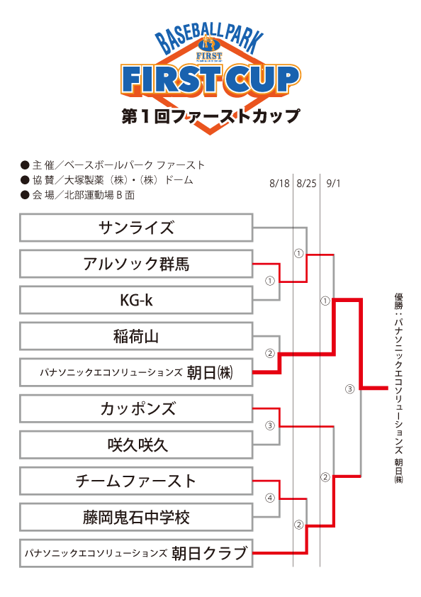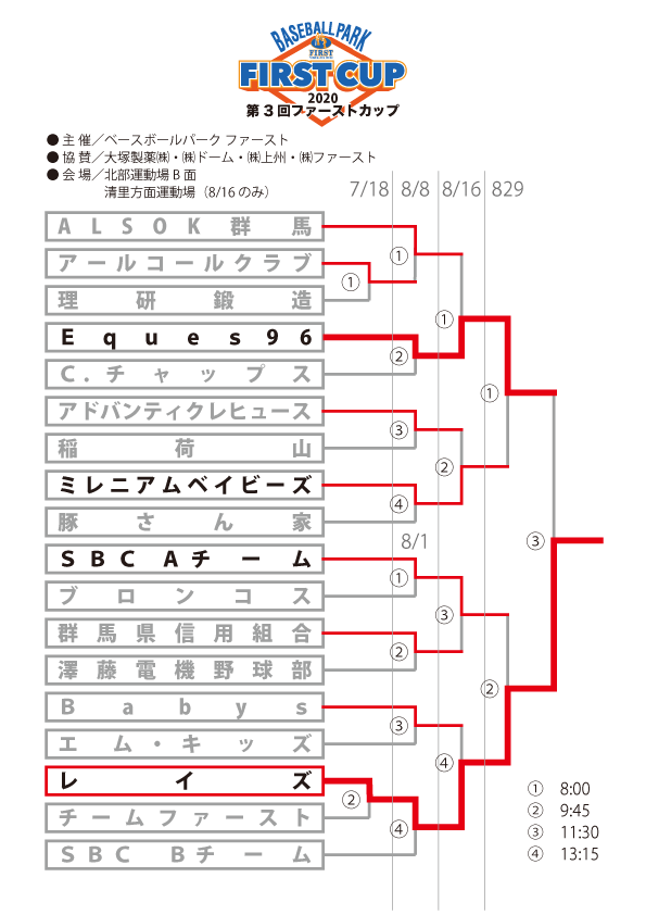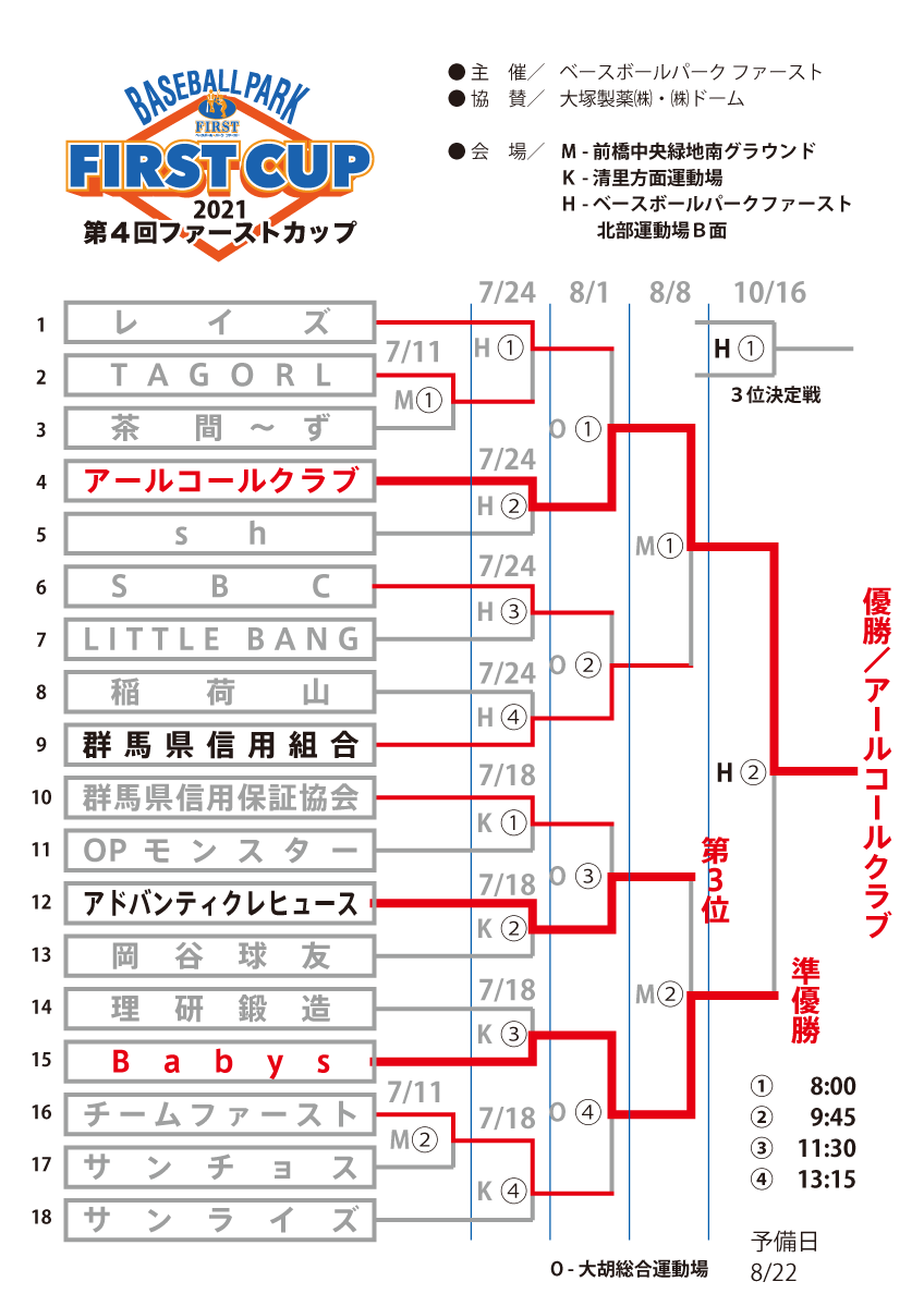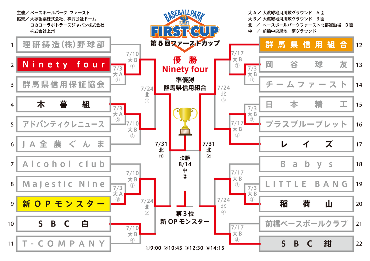 | 場所 | 大渡緑地河川敷グラウンドB面 / 前橋市総社町総社1053 ベースボールパークファースト北部運動場B面 / 前橋市上細井町2127-4 前橋中央緑地南グラウンド(旧前橋商業高校グラウンド) / 前橋市石倉町4-19 |
