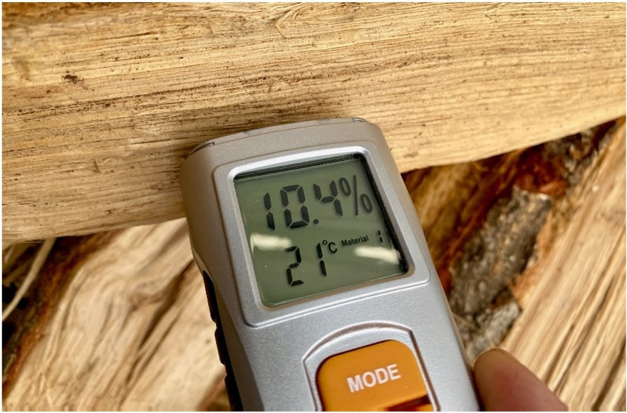 薪において木の種類と同じぐらい大切なのが水分量。伐採直後の生木だと50%以上ですが、最低1年間日当たりが良く風通しの良い場所で、10%以下まで乾燥させています。(薪ストーブに最適なのは20%以下と言われています。)